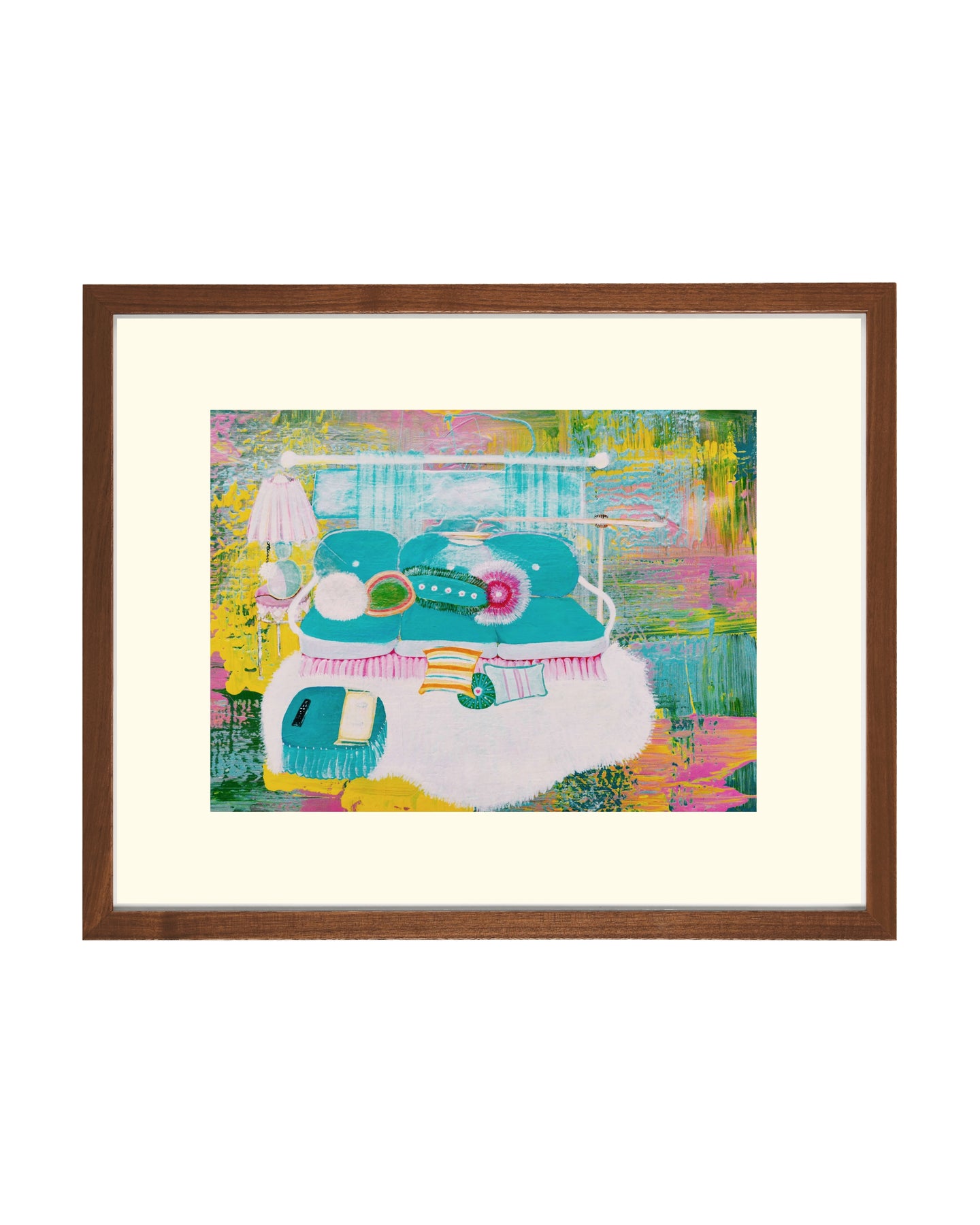 Drawing from her love of mid-century design and vibrant color palettes, her imagined rooms exist outside of time, familiar yet out of reach. They often evoke a sense of interminability while holding comfort, warmth, mystery, and intrigue.